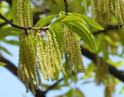 開花時期は4月の初めごろで、葉の展開とともに花を付けます。雄花序は前年に伸びた枝の芽から垂れ下がり、長さ10cmほどになり、