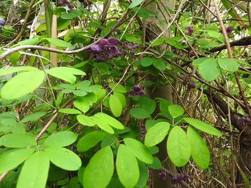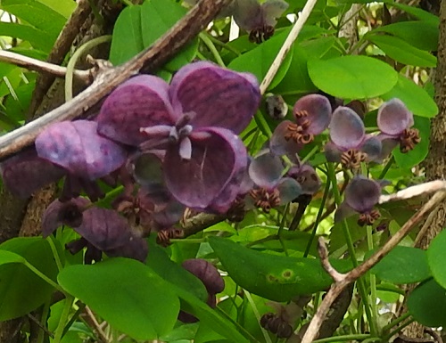 アケビとミツバアケビの花はよく似ていますが、大きさではアケビの花の方が大きい点と色ではミツバアケビの花の方が濃い点から区別できます。