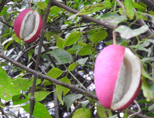果実は長さ5~10cmの楕円形で、9~10月に紫色に熟すと裂けます。