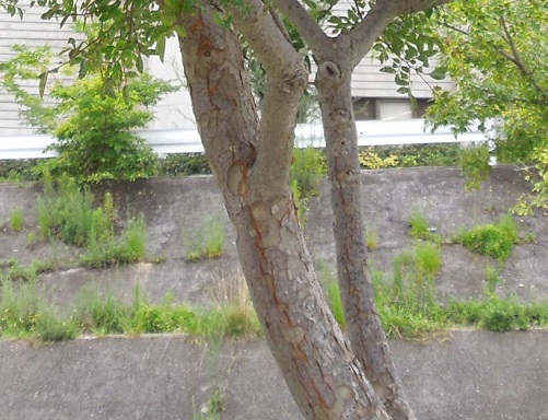 剥がれた跡は褐色の皮目が目立つようになり、少し赤っぽく見えるのでアキニレの樹であることが確認できます。