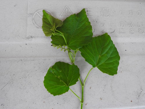 葉はサンカクヅルに似ていますが、側脈の数がサンカクヅルに比べ少ないことと、通常は不分裂葉で、