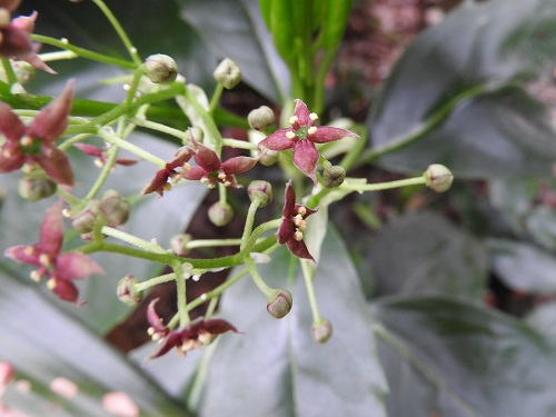 花期は3-5月で、枝先に円錐花序をだし、茶紫の小さな花を多数付けます。