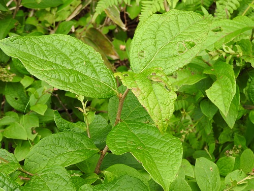 葉の長さは7-8cm、幅は3-5cmでナツハゼより大きく、互生します。葉の形は広楕円形で丸みが強く、表面は葉脈部分が下方にへこむので葉脈が目立ちます。