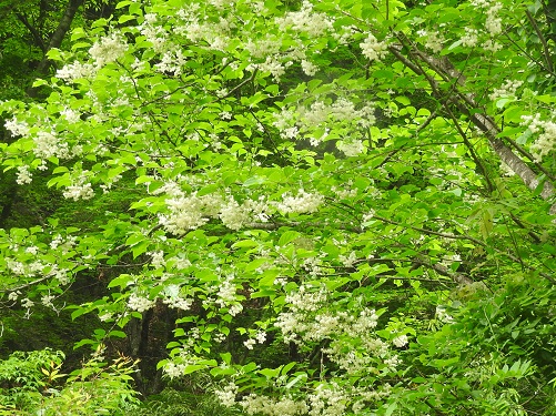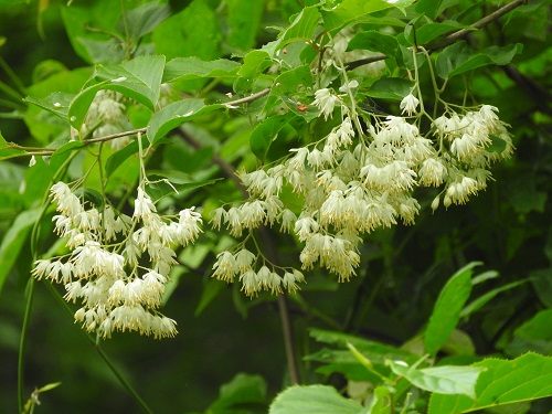 花期時期は5~6月で、エゴノキ、ハクウンボクに似た白い花を多数付けます。花は小さく房状の複数総状花序を垂れ下がるように付けます。