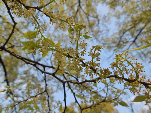 エノキの花は若葉が出てくると同時に咲き、この時期は樹全体が淡い黄色に覆われていて