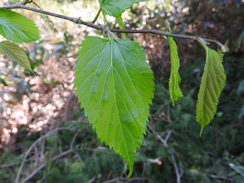 葉の縁にははっきりとした鋸歯があり、エノキより鋸歯は鋭く尖り、葉の基部まである。