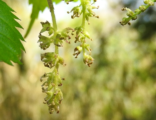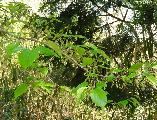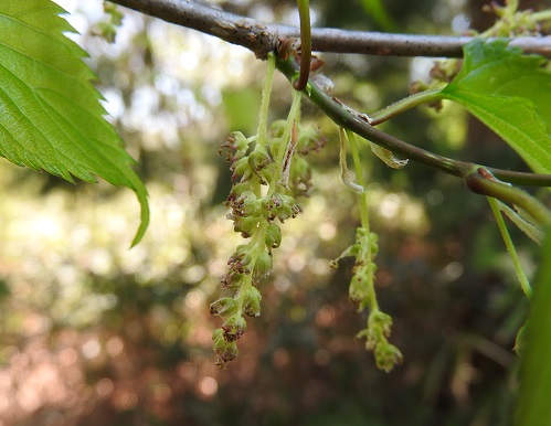 花は5月頃、葉の展開と同時に咲きます。雄花は本年枝の基部に束生し、上部の苞または葉の腋に両性花を1個付けます。