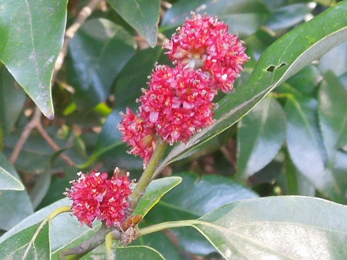 開花時期は3月上旬から4月中旬で、あずき色の赤い花が葉の下に短い柄で群がって咲かせます。