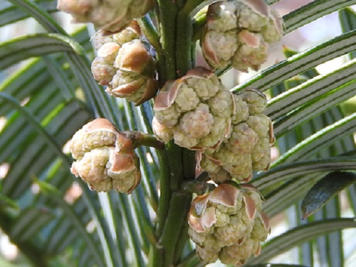 3~4月に開花し、雄花は前年枝の葉腋に6~10個球状に集まって付きます。雌花は緑色で短い柄がある。