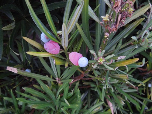 イヌマキの葉は、10~15cmの線形で、互生します。ラカンマキは4~8cmと小型です。