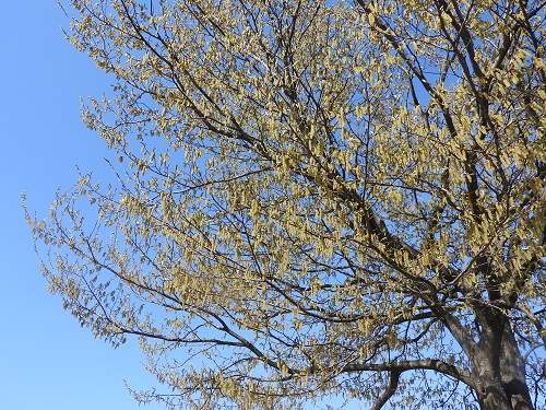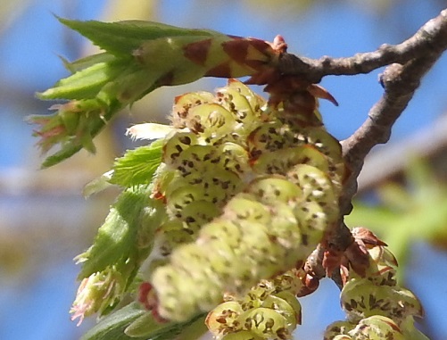 シデ類は春に付ける花(雄花)は枝から花穂をぶら下げます。雌花は、本年枝の先端や短枝の腋から新葉と同時に冬芽から出てきます。