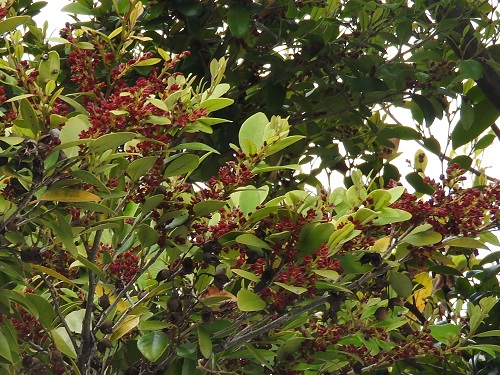 宮島にはイスノキが優占する森林があります。沿岸部の低地に生け垣として植栽されています。