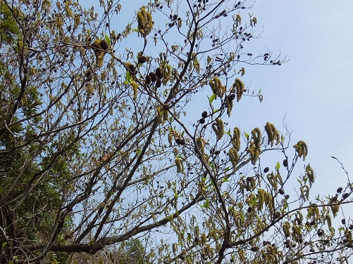冬には茶色の果穂と緑色をした雄花の冬芽が一緒に付いています。