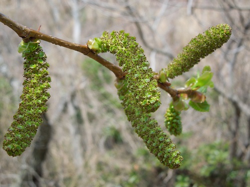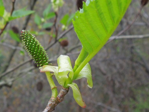 開花時期は3月頃で、雌花序は雄花序より上に付きます。ヤシャブシ類の中で唯一、葉、雌花、雄花の順に付きます。