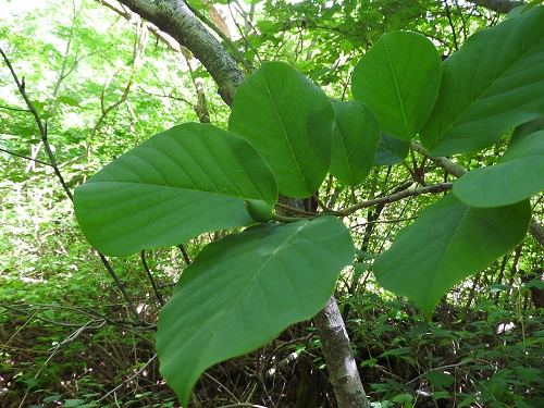 葉は枝先に集まって互生し、コブシやハクモクレンより幅広い葉形で、やや厚くて硬い。