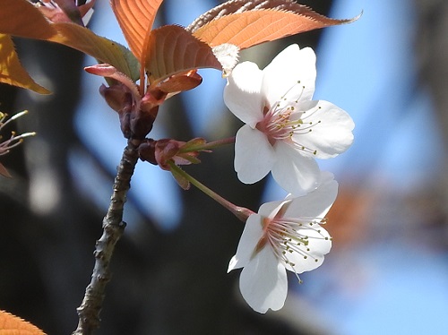 若葉はヤマザクラ同様赤みを帯びます。葉は楕円形あるいは卵状楕円形で縁には比較的大きな重鋸歯があります。