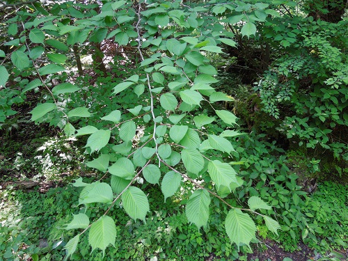 不分裂葉はハルニレに似ていますが、オヒョウでは葉柄が短いことと葉身基部がハルニレより広いことで区別できます。