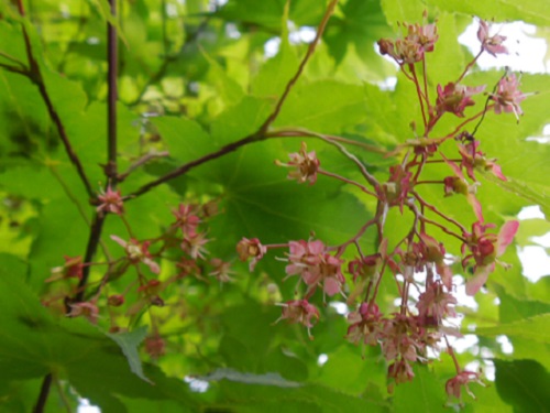 開花時期は4~5月で、展葉後、散房花序に小さな赤い花を多数付けます。花は、雄花と両性花が混生します。