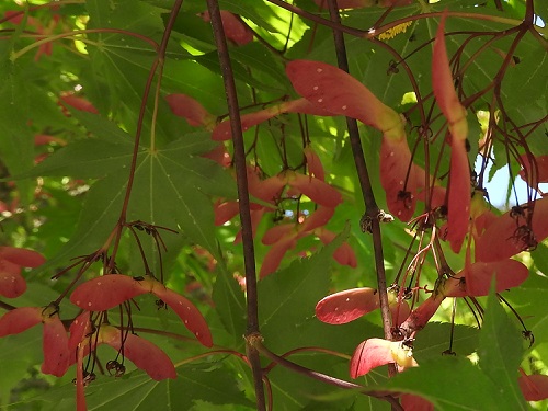 果実は6~9月に熟し、翼はほぼ水平に開きます。果実の若い時点では薄紅色になり美しい。