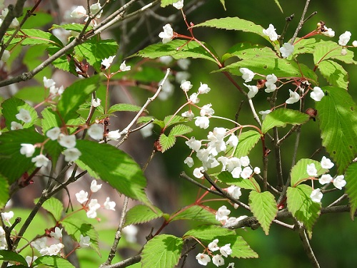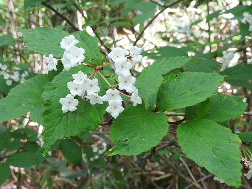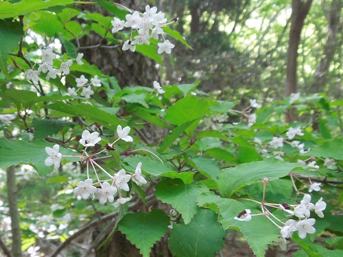 開花時期は5~6月で、枝先から散房花序を垂らし、白い花を5~10個下向きに付けます。ガマズミの様に花の数は多くありません。