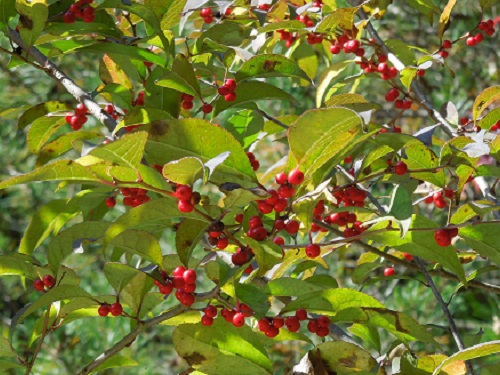 果実は直径約5mmの球形で、9~10月に赤く熟します。実は葉が落ちた後も枝に残るのでよく目立ちます。