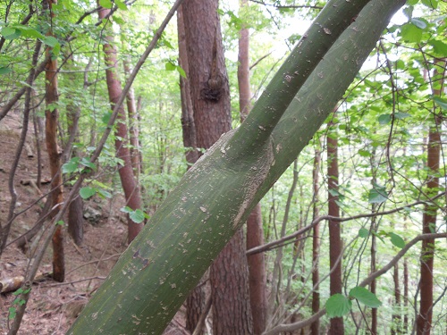 樹皮は青緑色を帯び縦に濃緑色の筋が入ります。この様に緑色の樹皮に黒い筋が入る様子が瓜に似ています。