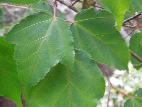 葉は小型で、浅く3裂する形が基本ですが、成木の樹幹上部はほぼ不分裂の葉が多く、徒長枝では5中裂する葉もあります。