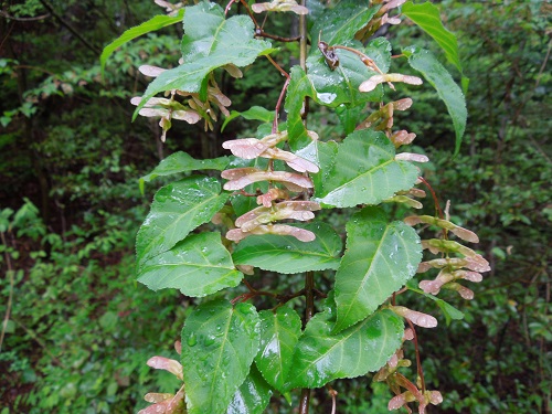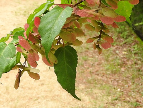 翼果は長さ2cmでほぼ水平に開き、赤みを帯びてよく目立ちます。
