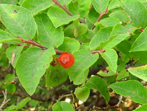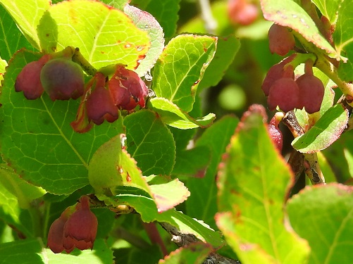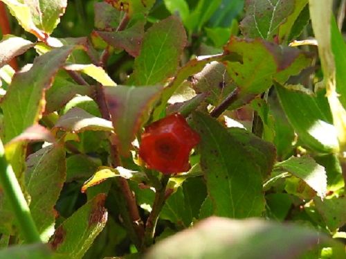 スノキの実は丸くて黒く熟しますが、ウスノキの実は5稜をもつので角ばっておりイロハ真っ赤に熟します。実は食べられ、甘酸っぱくて美味しい。