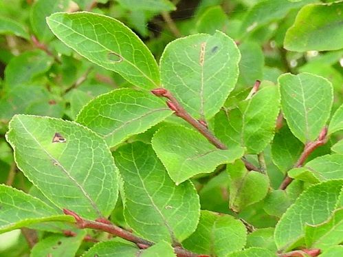 葉は互生(ごせい)し、形は卵状楕円形で長さ2~5cmです。葉の縁には細かい鋸歯(きょし)があります。
