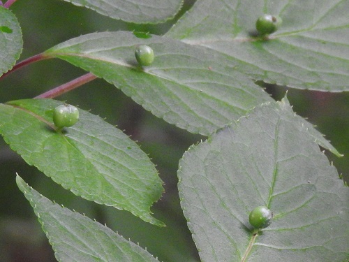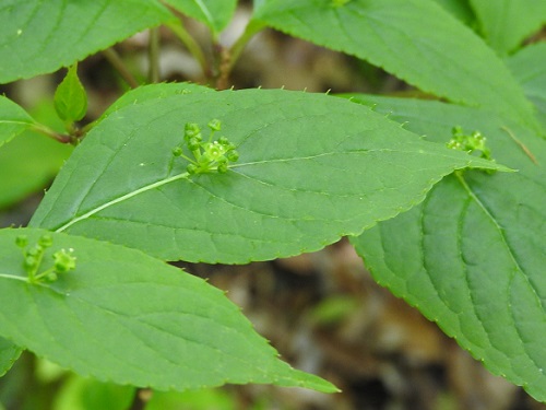 開花時期は5~6月で、葉の表面の主脈の中央に淡い緑色の小さな花をつけます。