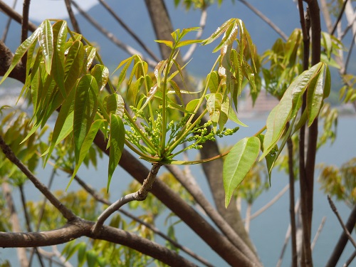 開花時期は5~6月で、葉腋から長さ約10cmの円錐花序をだし、黄緑色の小さな花を多数つけます。