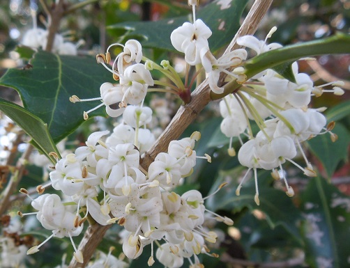 生垣によく使われるヒイラギモクセイはヒイラギと銀木犀を交配し多岐で、やはり11月頃に白い小さな花をたくさん付けます。