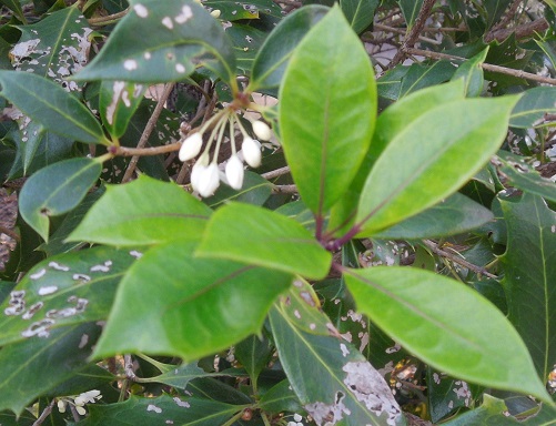 雌雄別株で、花期は11月~12月で、葉腋に芳香のある白い花を束生します。樹高は4~8mになります。