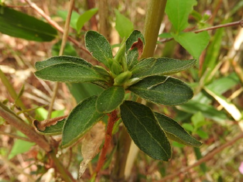 ヒメヤマツツジの夏葉はかなり小さい方で、長さ1cm前後で細く、幅は狭い。春葉は長さ2~3cmの狭楕円形で先端は尖ります。
