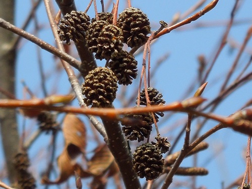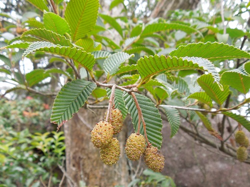 一方、オオバヤシャブシは逆で、枝の一番先に雌花序が付き、その下に雄花序が付きます。