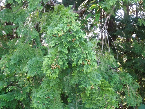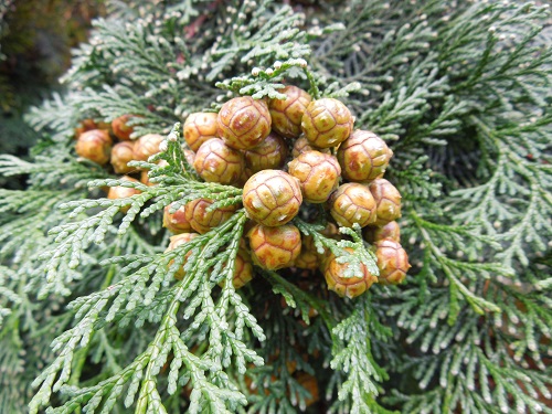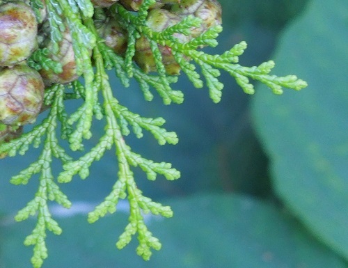葉は長さ1~3mmの鱗片状で、先端はスギの様に尖りません。葉は十字対生し、密生した側枝の葉は互生し水平に並びます。