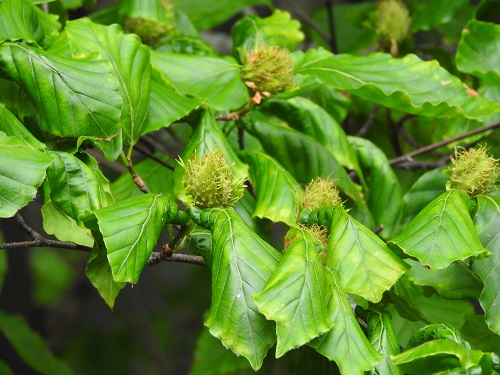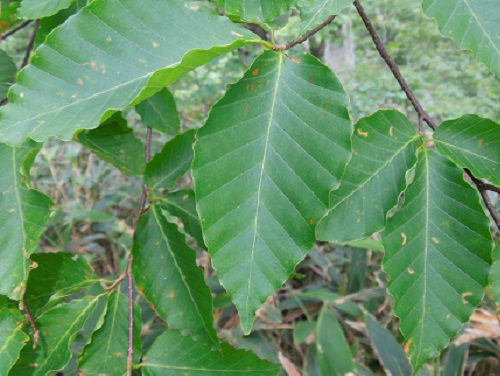 葉は平行の側脈が目立ち、縁に波形の鋸歯があります。側脈は縁の凹んだところに向かっているのがブナの最大の特徴です。