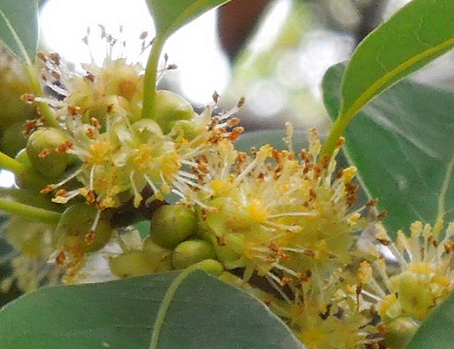 開花時期は8月下旬~9月初旬で、無柄の散形花序に淡黄色の花を数個集まって開きます。雌雄異株です。