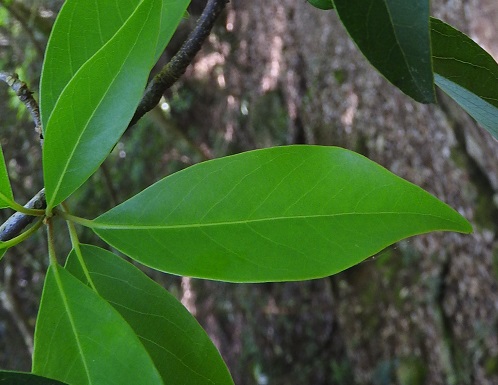 葉身長は7~13cmで、縁は全縁です。葉はタブノキを小さくした形で、枝先に集まって互生し、表面には光沢があります。
