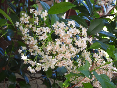 開花時期は5~6月頃で、複散房花序に直径約10cmの小さな白い花を多数咲かせます。
