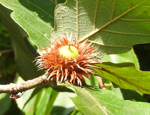 堅果の殻斗の鱗片は線形でらせん状に付いていて、殻斗の約半分を覆い隠しています。