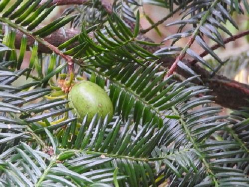 カヤの実は熟しても緑色です。キャラボクとイチイの実は仮種皮が紅くなり、よく目立つようになります。