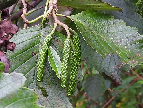 雌雄同株、雌雄異花で、3~4月に葉に先立ち花を咲かせます。 枝の先から、雄花序、雌花序、葉芽の順に付けます。