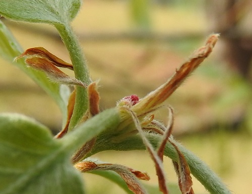 非常に小さくて判りにくい写真ですが、枝の先端から伸びてきている茶色の若葉の葉腋に小さく赤く見えているのが雌花です。
