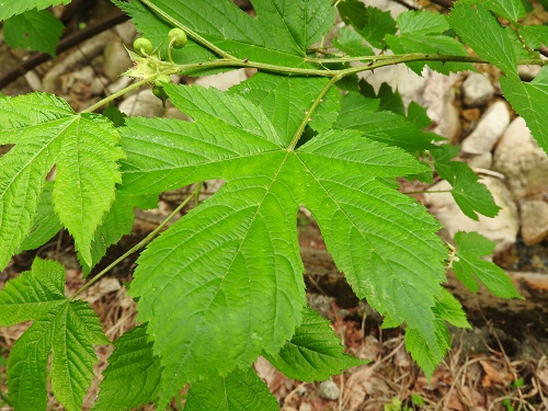葉身長6~10cmの広卵形で掌状に3~5裂しています。この点は、ナガバモミジイチゴの葉と同様ですが、