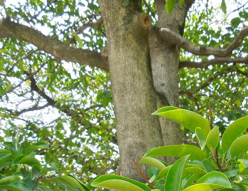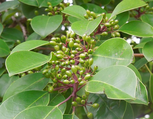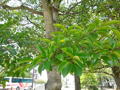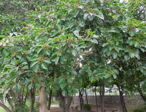 開花時期は5~6月で、葉腋に淡い紫がかった白色の花を付けます。沿岸から低山の照葉樹林に自生し、樹高は約20mになります。