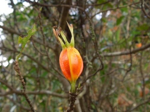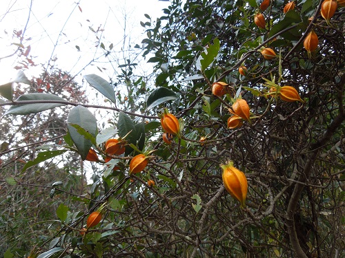 果実は長さ約2cmの楕円形で5~7個の稜があり、先に細い萼片が残り、冬に橙色に熟します。