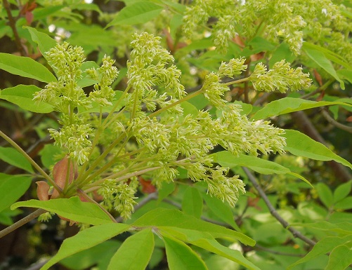 開花時期は4~5月で、枝先や葉腋から円錐花序をだし、白い花を多数つけます。マルバアオダモは雌雄異株で、雄花と両性花があります。