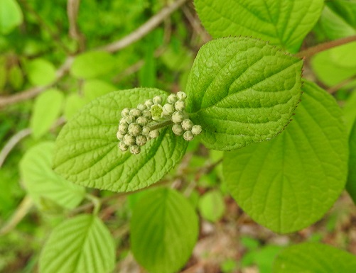 名の通り葉は幅広い楕円形から卵形で、葉脈が窪んでよく目立ちます。鋸歯の先はウツギ同様短い糸状になっています。